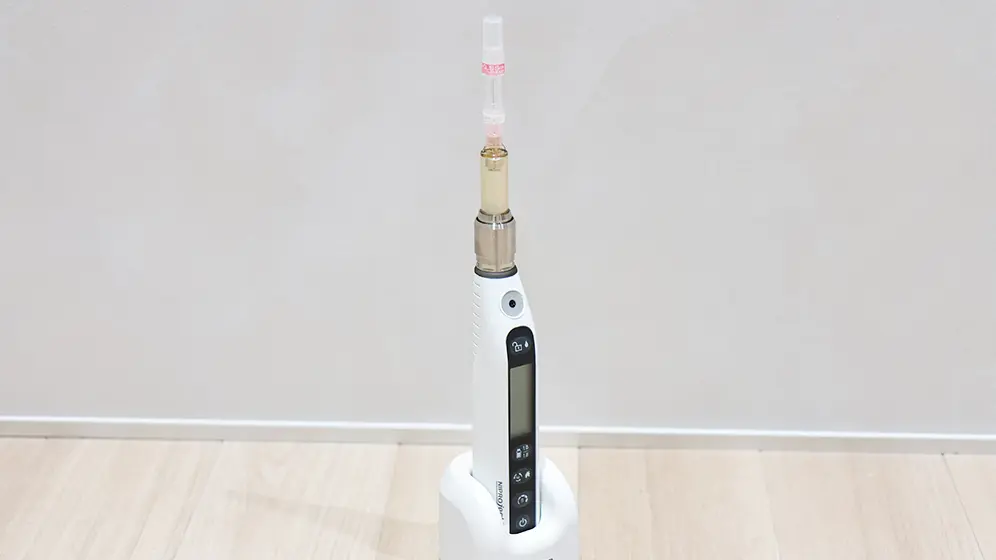 麻酔注入時の痛みや違和感を軽減するための処置を行なっています。針を刺す皮膚に表面麻酔薬を施し、刺さるときの痛みを抑えます。電動麻酔注射器は一定の力で麻酔薬を注入できる装置で、ムラなく丁寧に注射できます。注射が苦手な方でも、ストレスをあまり感じずに治療を始められます。